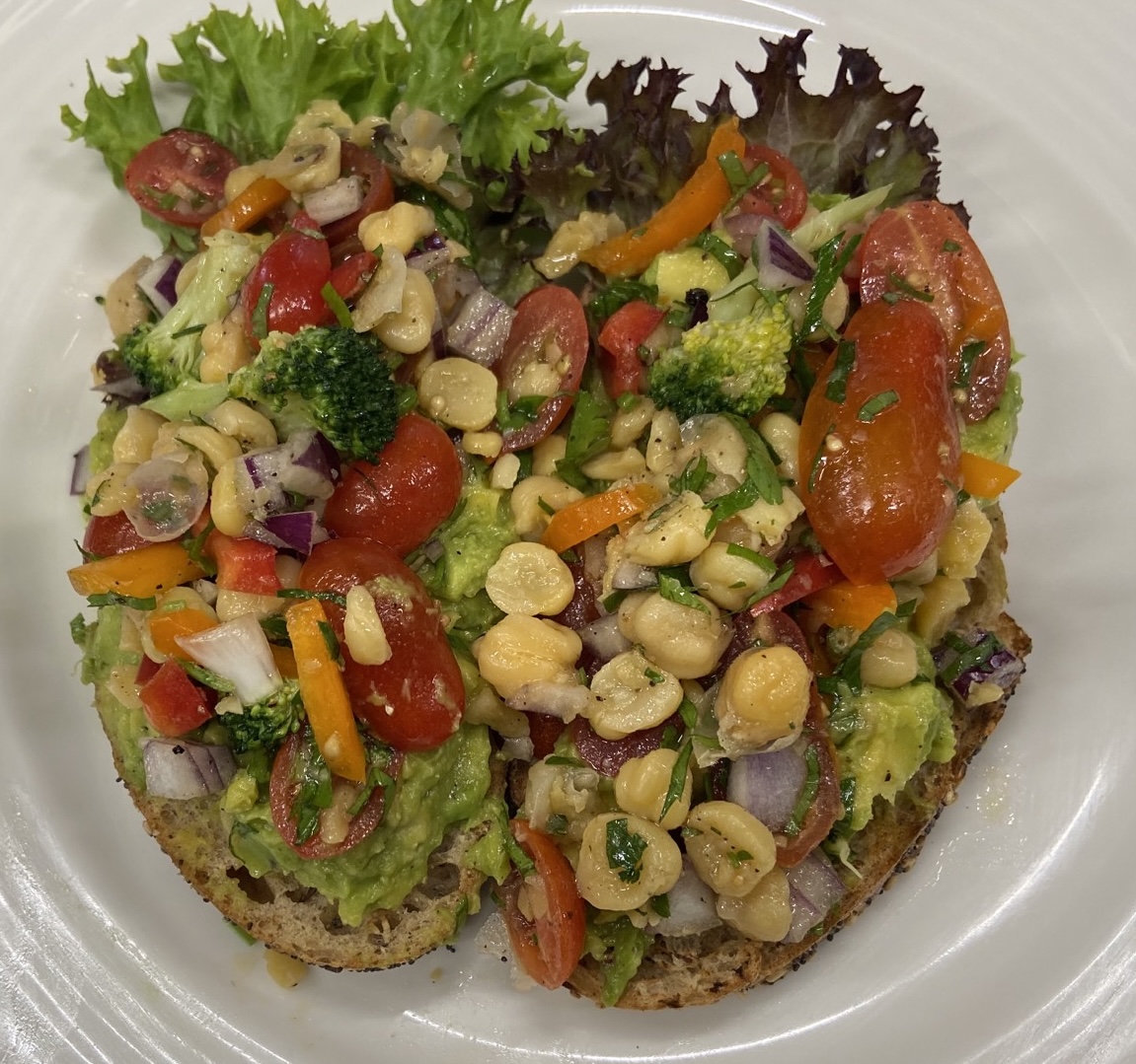 Βραδινό: Ψωμί ολικής με αβοκάντο, λαχανικά, τόφου τυρί σόγιας και σαλάτα με ελαιόλαδο.